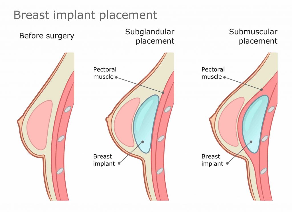 During breast augmentation surgery, Dr Mark Doyle will generally insert the implants in one of several possible locations (placement options). The most common placement option amongst his patients is the sub muscular or dual plane placement. This techniques is more complex and time consuming. However, he believes is provide optimal surgical outcomes.